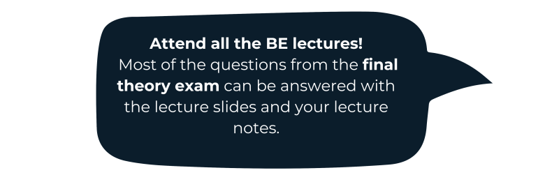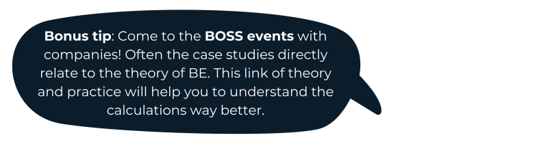 It's important to know that the main focus in BE until Christmas should be on mastering the calculation skills . Until Christmas, it's sufficient to only read the abstracts, so you know a bit what the literature they refer to in the lectures is about. Study the calculation assignments every week to avoid a super stressful study week before the exam. It also helps a lot to work your way through the Excel sheets together with a friend – and it's more fun that way!