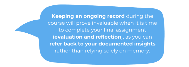 Engage in conversations with peers to share what you are learning and gain different perspectives. Additionally, keep a small personal ‘journal’ to record your thoughts, findings, and reflections concerning the project and process.